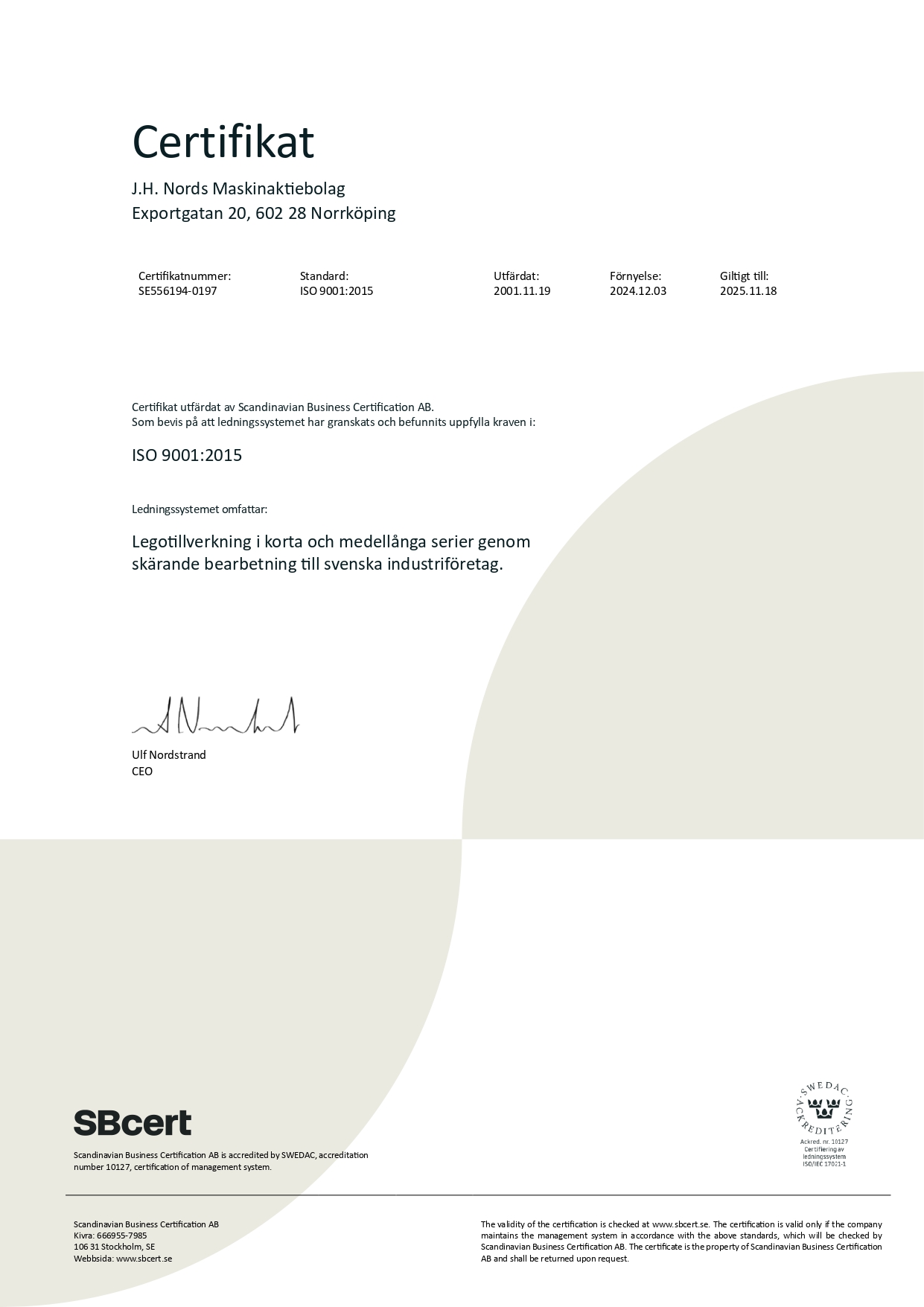 Nords Maskin jobbar i huvudsak med legotillverkning i korta eller medellånga serier. Vårt viktigaste konkurrensmedel är hög kvalitet som uppnås genom att ständigt utveckla samarbetet med kunderna samt investeringar i ledande innovativ teknik och kompetent personal.